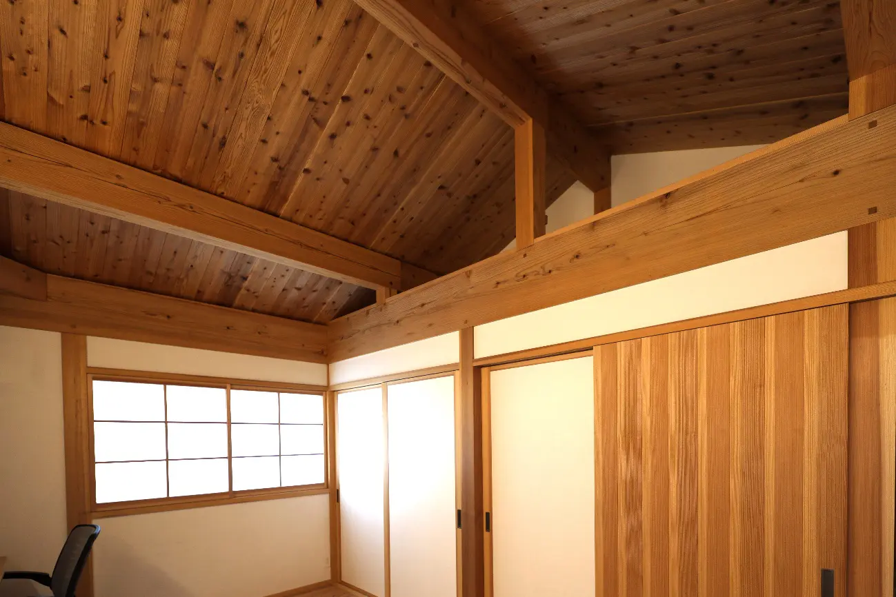 無垢の製材による小屋組と野地板杉材の現し