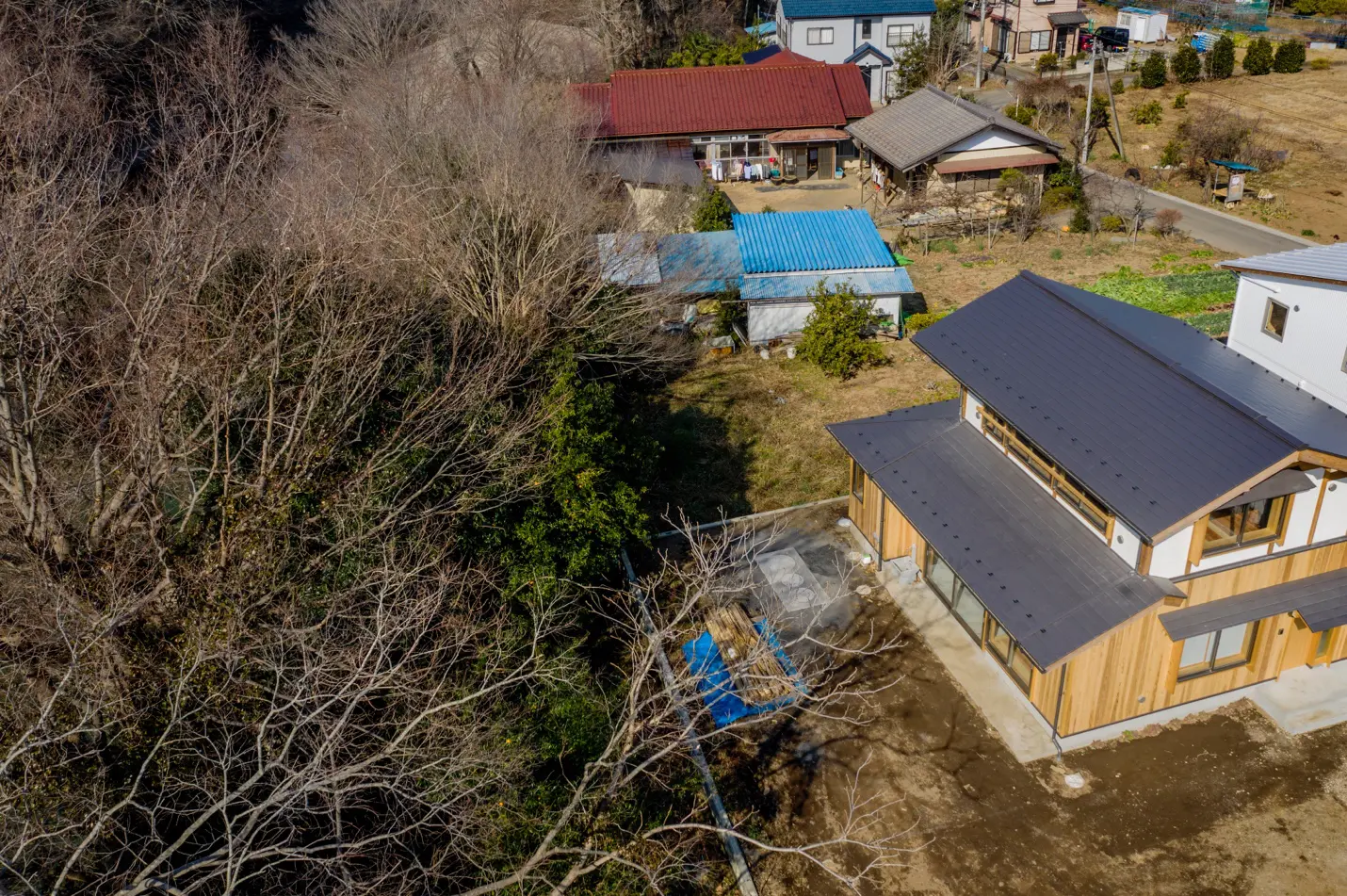外壁の一部を内外真壁とし、漆喰と板張りの昔ながらの建物の外観とした。自然豊かな風景に調和した自然素材主体の外観、と切妻形式の屋根の採用で、やがて集落感のある風景の創出を目指している。隣地には弊社が設計を担当させていただいた別の住宅も建っており、屋根勾配を揃えたり、外壁に杉板貼りを採用するなど、家の外観の調整が連なるような配慮をしている。