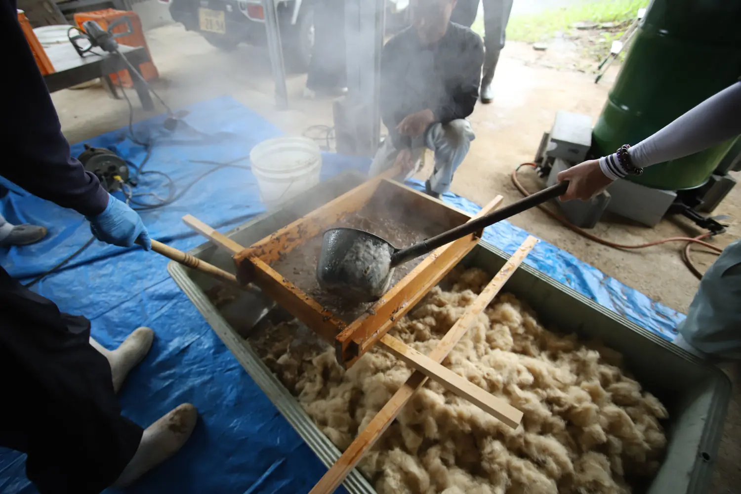 使用する漆喰は角又(海藻)を炊いて麻スサと石灰を混ぜてつくる。左官仕事は壁を塗るだけでなく、壁を塗るための材料ごしらえからが本来の仕事であり、伝統技術を継承していくための機会とする。