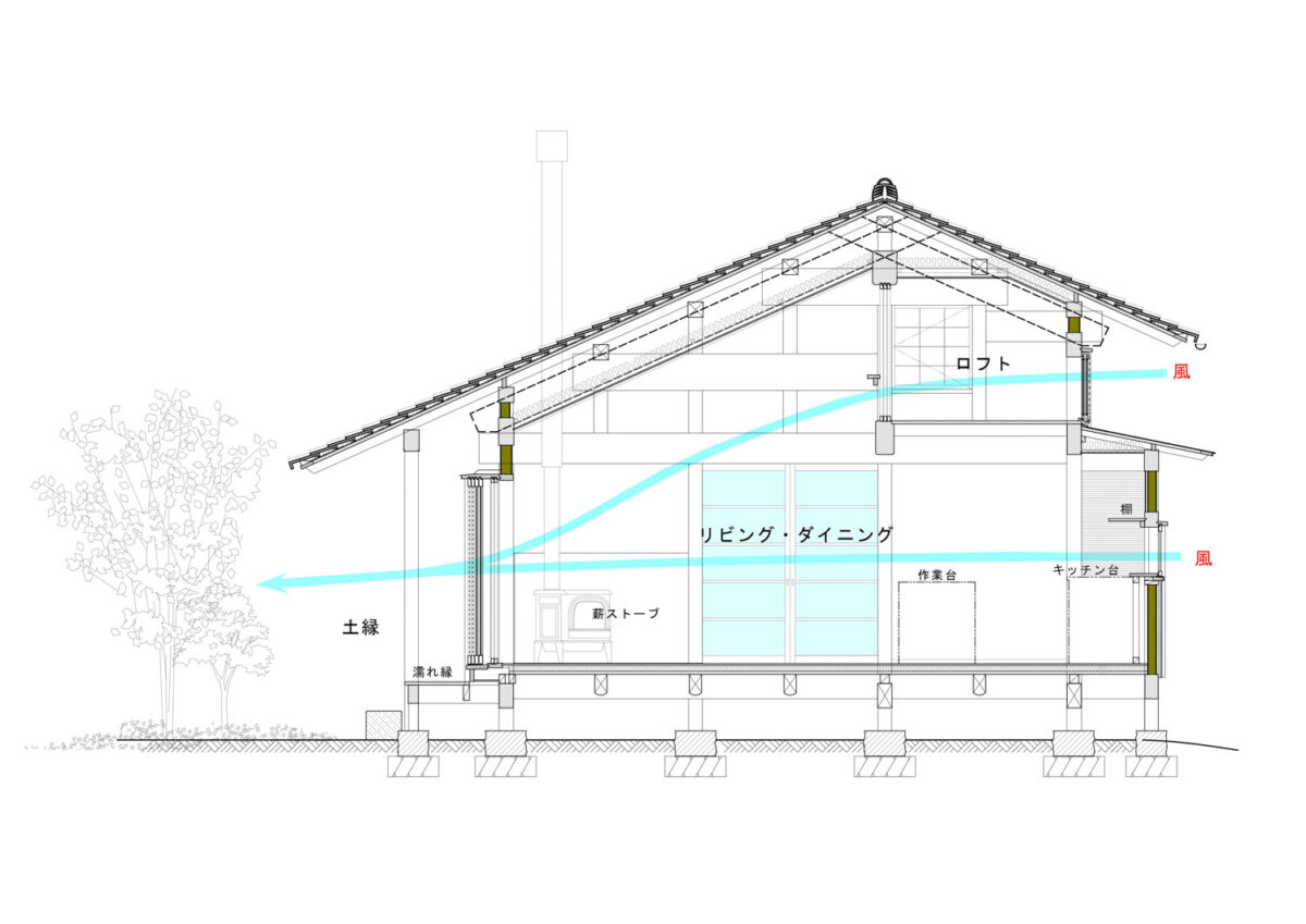 深い軒庇下は温熱的な緩衝空間となっており直射日光や日射の照り返しを防ぎ、引戸形式の多層構成の建具による大きな窓からの風通しを何時も容易とする。小屋裏収納やロフトに設けた高窓は家全体の通風としての役割と屋根からの輻射熱の排熱を人為的にコントロールできる造りにしてあり冬期夏期の室内温熱環境を設備に頼り過ぎないようにしている。