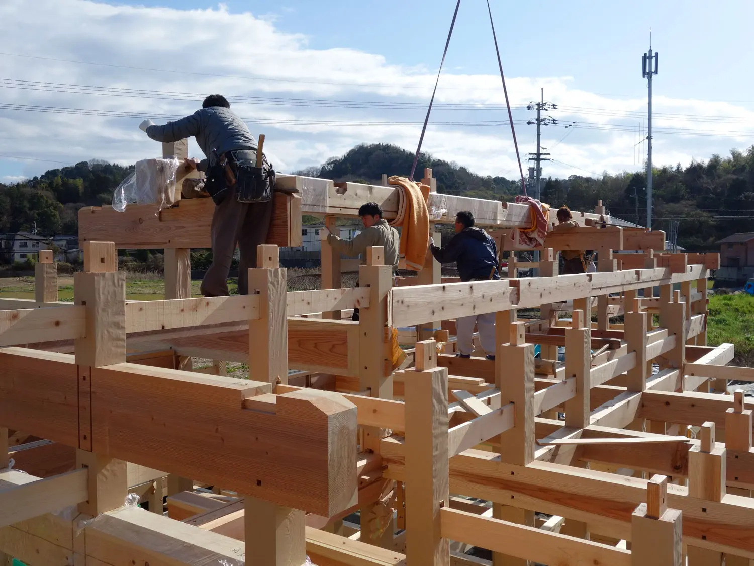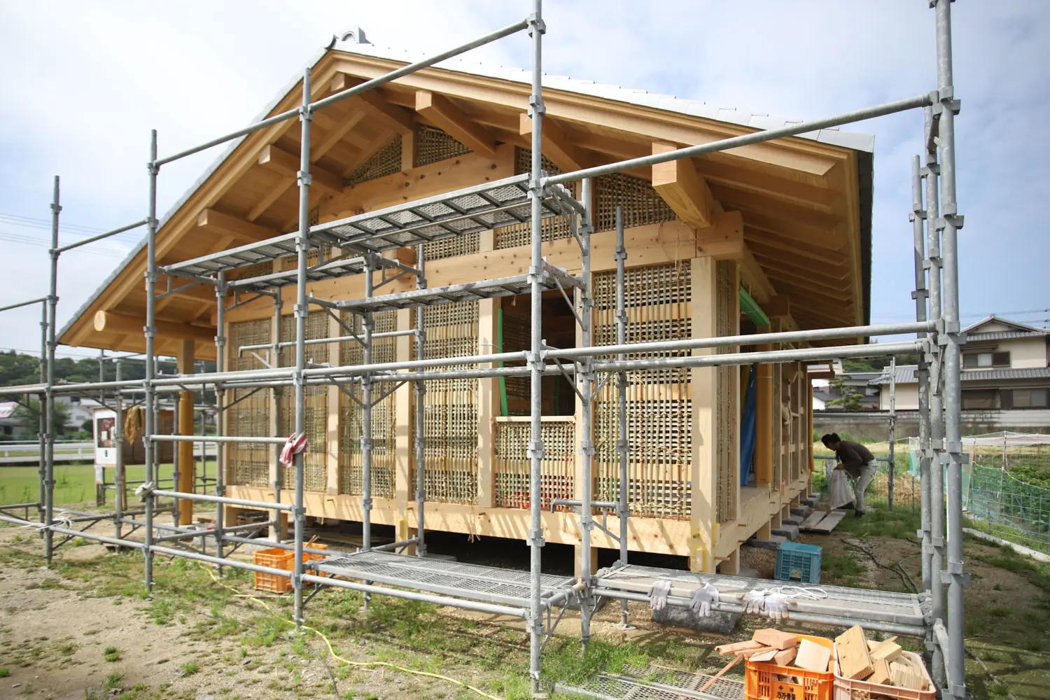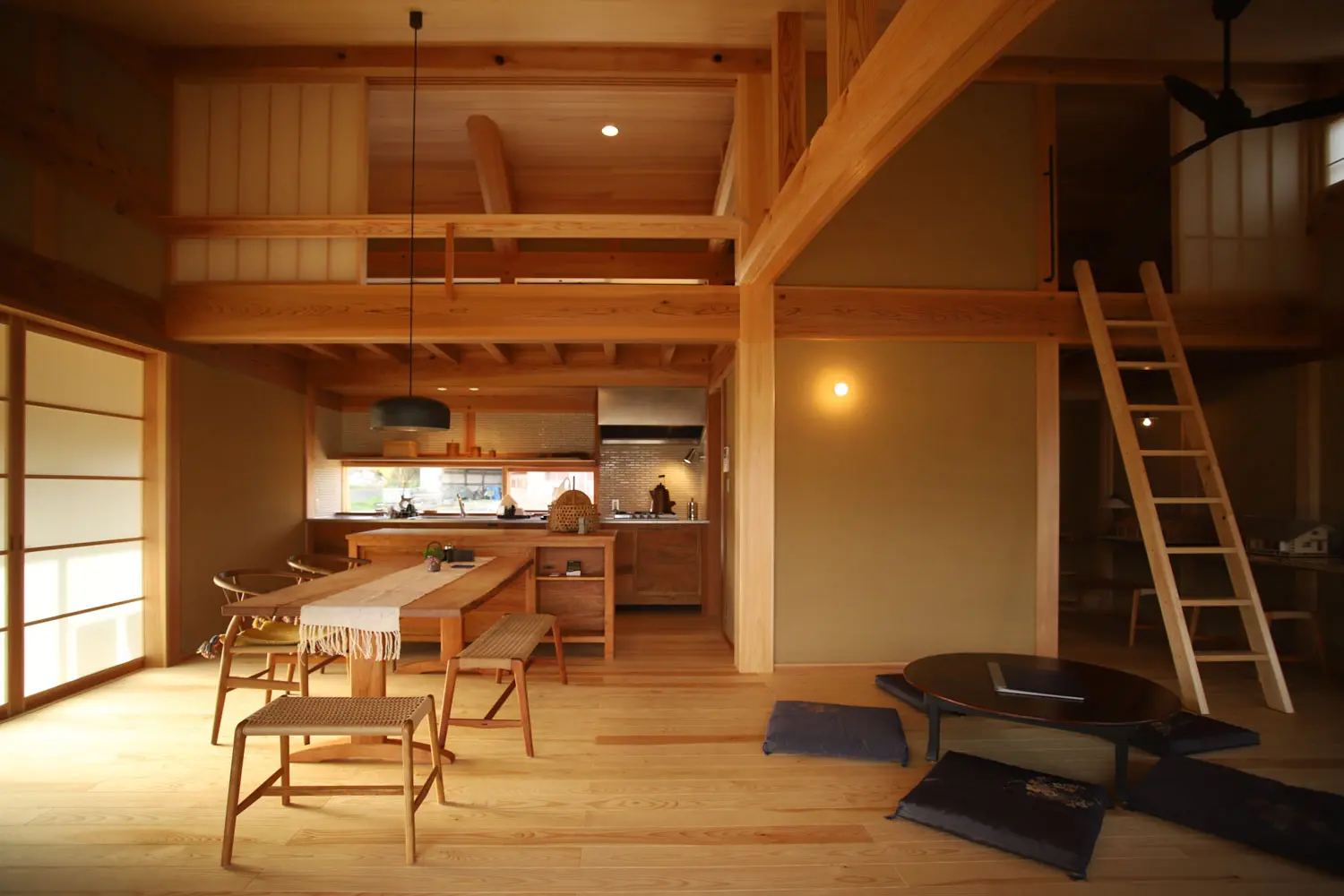 骨太の地域木材をつかった石場建て伝統構法であり、環境負荷のない自然乾燥による。手刻みによる伝統的な継手仕口を使用、和小屋や多重梁、差鴨居・足固による軸組である。維持管理しやすい真壁土壁など土に還る素材や工法を選択。