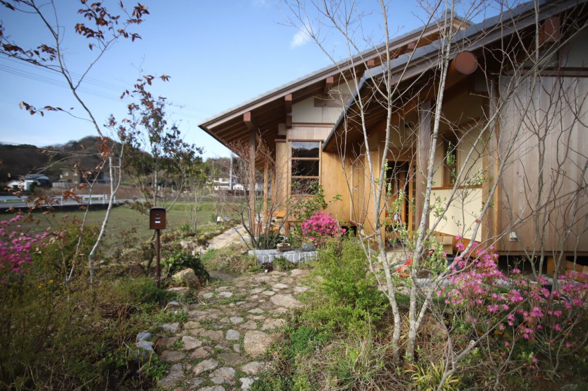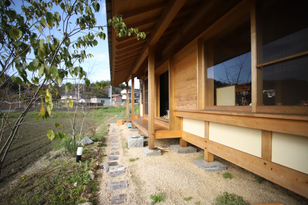 建物は田舎の風景に突出するようなボリュームではない平屋とし、地場の素材を活かしつつ美しい風景としての家を計画。木組みと土壁、大島石をつかった石場建てとし、屋根は地元菊間瓦にてシンプルな切妻構造とし後々のメンテナンスのし易さと耐久性を考慮。卓越風を招き入れるための開口部、そして強い日射を遮る為と近隣住人が寄り付きやすいように建物南全面に深い軒下空間を構えた建物形態とした。
